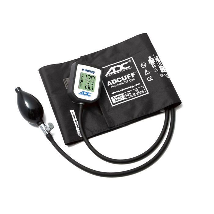 ADC's e-sphyg7002 is a revolutionary digital aneroid sphygmomanometer that replaces a gauge's vulnerable mechanical movement with virtually indestructible digital circuitry. The instrument requires use of a stethoscope for the traditional ausculatory method, replacing the analog or mercury gauge with a digital instrument featuring a bright, backlit LCD display in a splash and shock resistant housing.