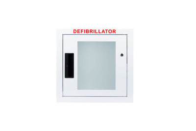 Fully Recessed small defibrillator wall cabinet with window and alarm; inside tub measures 14 1/4"L x 11 3/4"H x 6 3/4"W. Outside frame measures 16 1/4"L x 13 3/4"H x 3/8"W. Rough wall opening size: 15 1/4"L x 12 3/4"H x 6"W. Weight: 9 lbs.