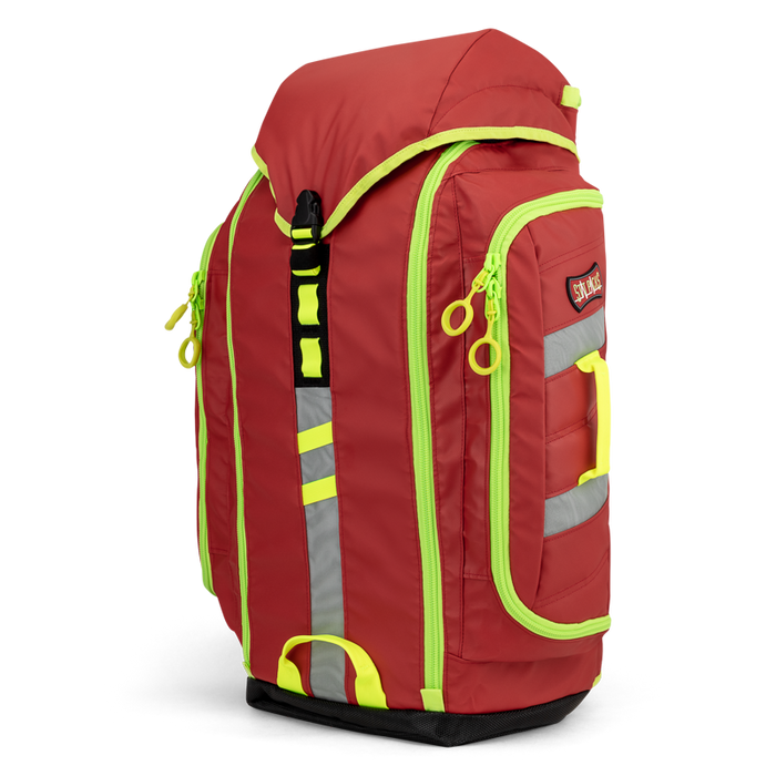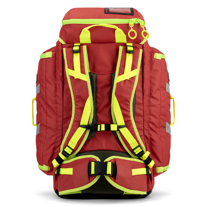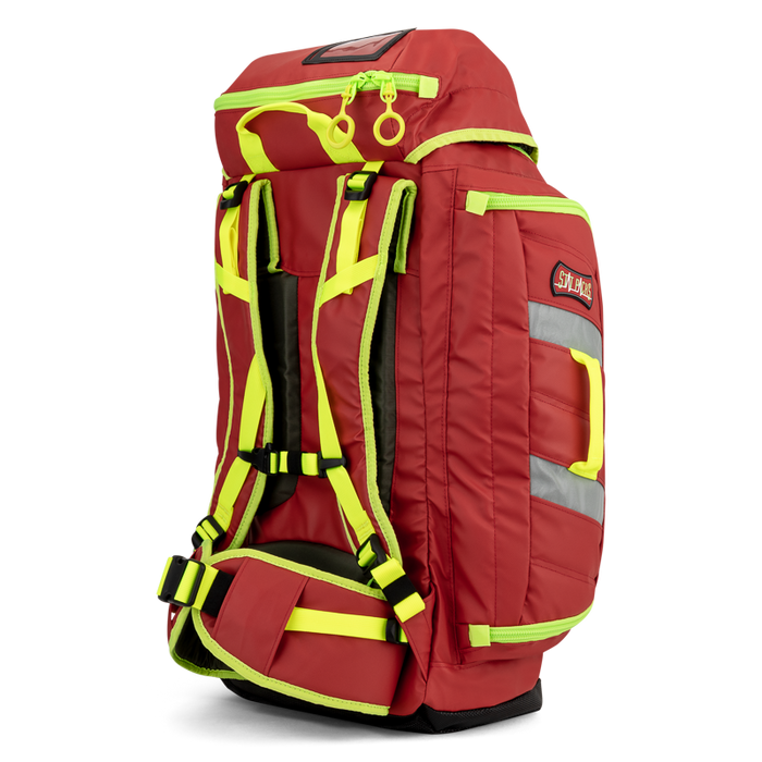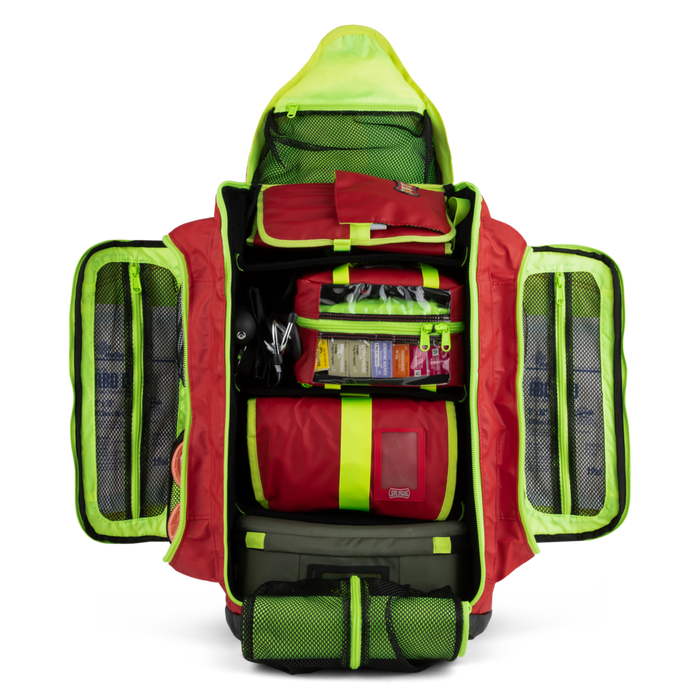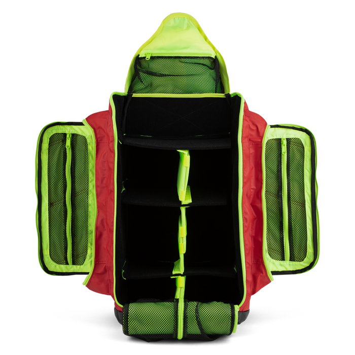 Unique designs allows access to the main compartment from the front of this medical back pack.