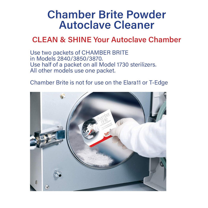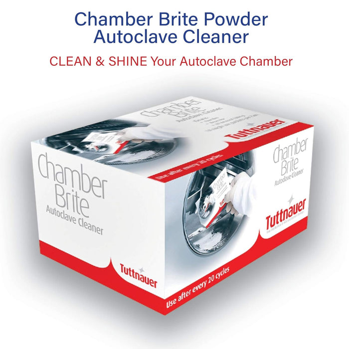 Chamber Brite powder is simply the easiest way to keep autoclaves clean and free of water deposit build-up. Designed specifically for steam sterilizers, Chamber Brite effectively cleans and descales the reservoir, chamber and tubing in minutes.